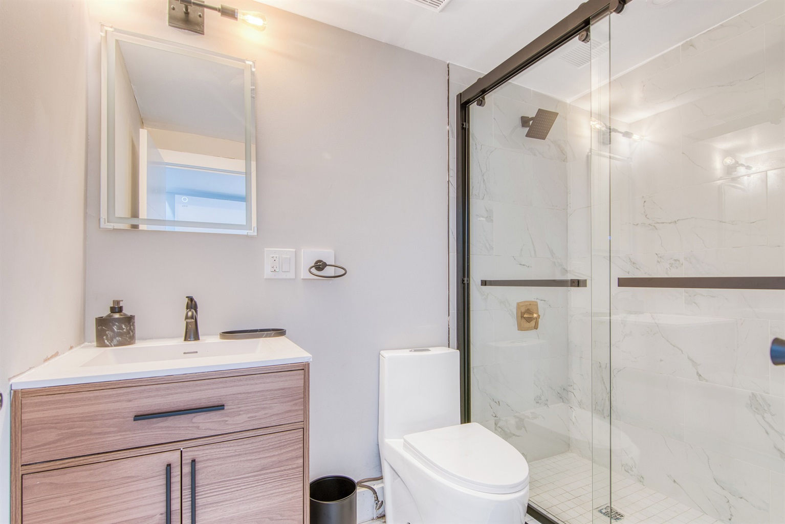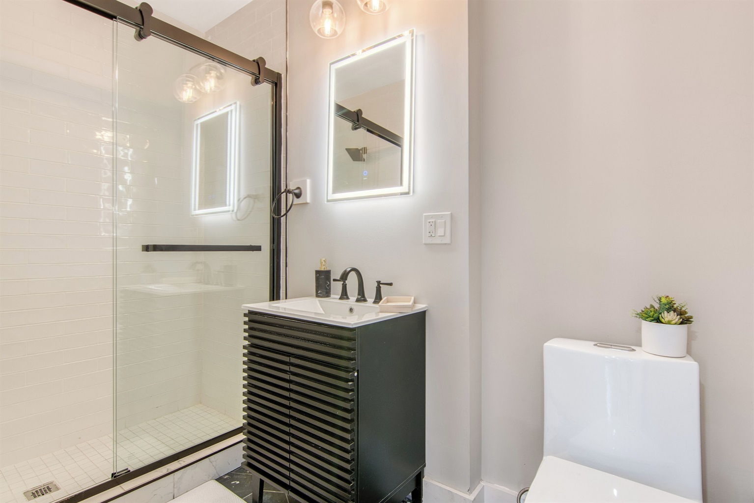 * Two sleek, modern bathrooms with rainfall showers, fresh towels, hair dryers, and hotel-style amenities.